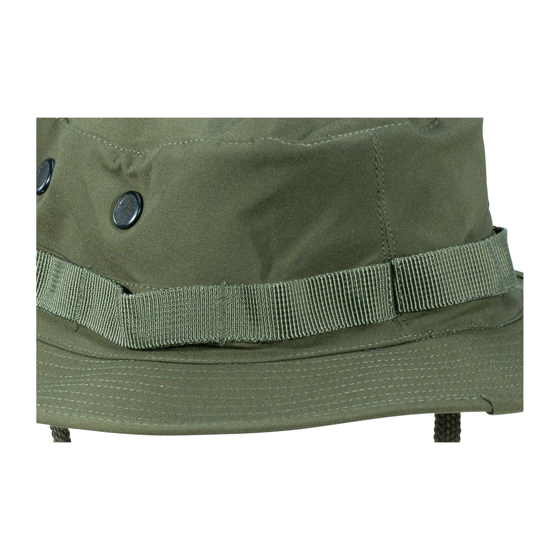 Waterproof Boonie Hat from a three layer laminate material with side vents for a comfortable head climate. The wide brim protects from sun and rain. The Boonie can be easily rolled up to save space. Adjustable chin strap. With attachment loops for camouflage material ect..