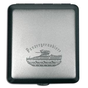Solid and stable metal box with satin nickel-plated surface for approx. 20 cigarettes. Classical German form. Engraved on the front.
