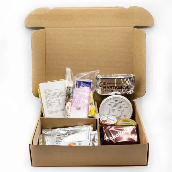 The EPA Type I daily ration Cevapcici consists of original Bundeswehr or equivalent items. The average nutritional value of the one-man pack is around 3000 kcal. Emergency rations are characterized by a high nutritional value and low weight and are ready to eat immediately. This makes them ideal for supplying food during outdoor and trekking activities. For easy storage, they are delivered in a flat cardboard box.