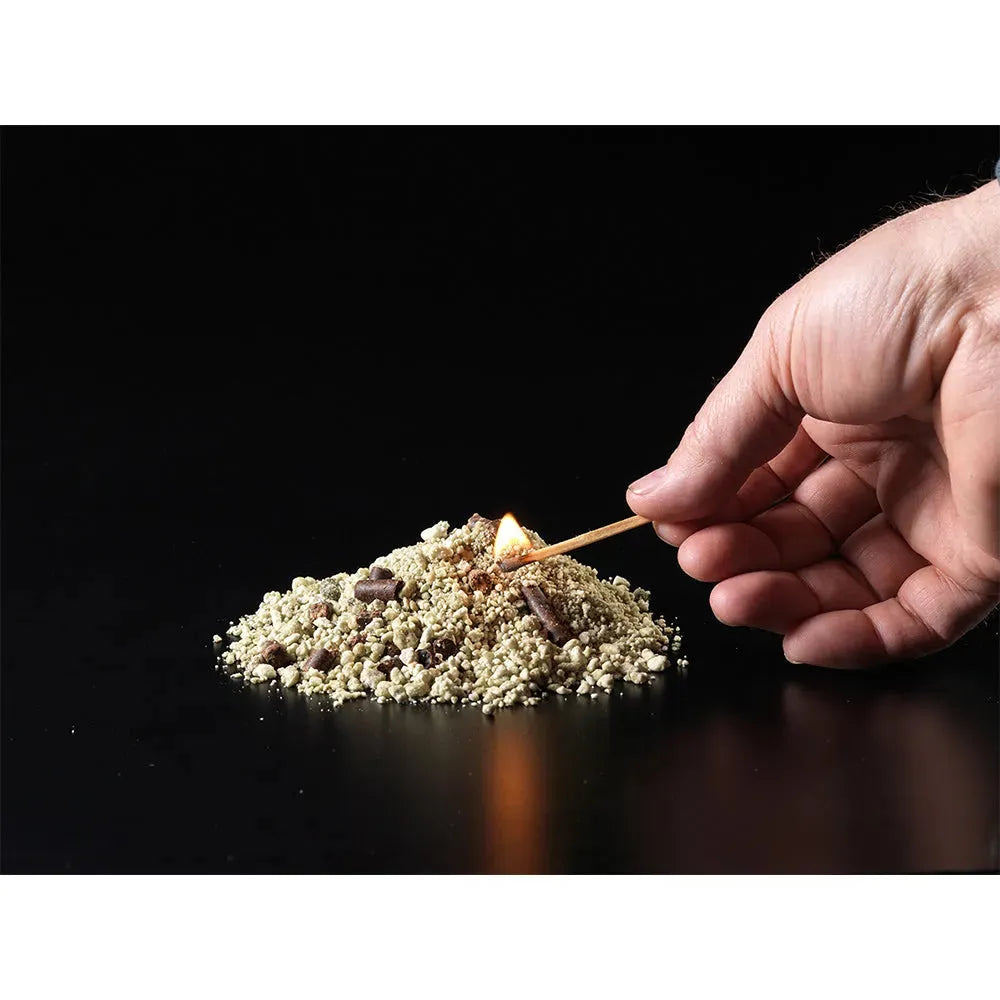 The fire starter burns for up to 25 minutes per pouch, generating a heat of up to 537°C (1000°F). This allows you to boil water, prepare meals or coffee, or simply light a fire in poor outdoor conditions or when tinder is unavailable.