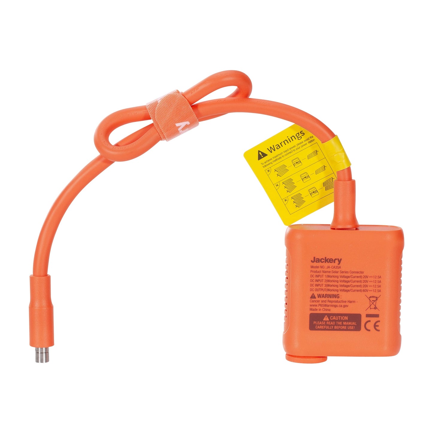 The Jackery Solar Panel Connector orange can be used for the Explorer 2000 Pro. Two or three solar panels can be connected in series. The socket features a toggle switch to allow easy switching between two and three solar panels. The solar panel connector features one male and three female connectors and is compatible with the Solar Generator 2000 Pro for convenient solar expansion. Made of PC material, the solar panel connection kit is durable and can withstand fire and harsh weather, making the product suitable for solar connection in most outdoor scenarios.
