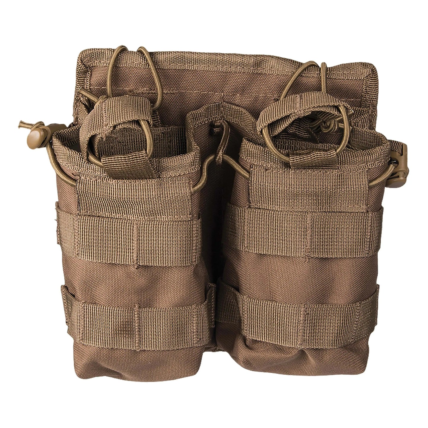 The double magazine pouch with two separate compartments for magazines. These are open at the top, which allows quick access to the magazine. Elastic cords with stoppers secured the contents. The MOLLE mounts on the front allows other objects to be mounted and the snap loops allow the pouch to be attached to a belt or other piece of equipment.