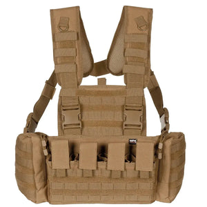 Two multi-purpose side pockets with two-way zippers, MOLLE webbing, and an internal D-ring allow you to store items such as a 1-liter US canteen. The chest rig also features four adjustable magazine pouches with hook-and-loop closures on the front. These pouches are compatible with all common magazines and can be used as double magazine pouches. A fold-down front panel with a map pocket and an internal front slip pocket with hook-and-loop closure complete the design. The entire vest also has MOLLE webbing and hook-and-loop panels on the outside for attaching additional gear. It can even be worn over ballistic vests.