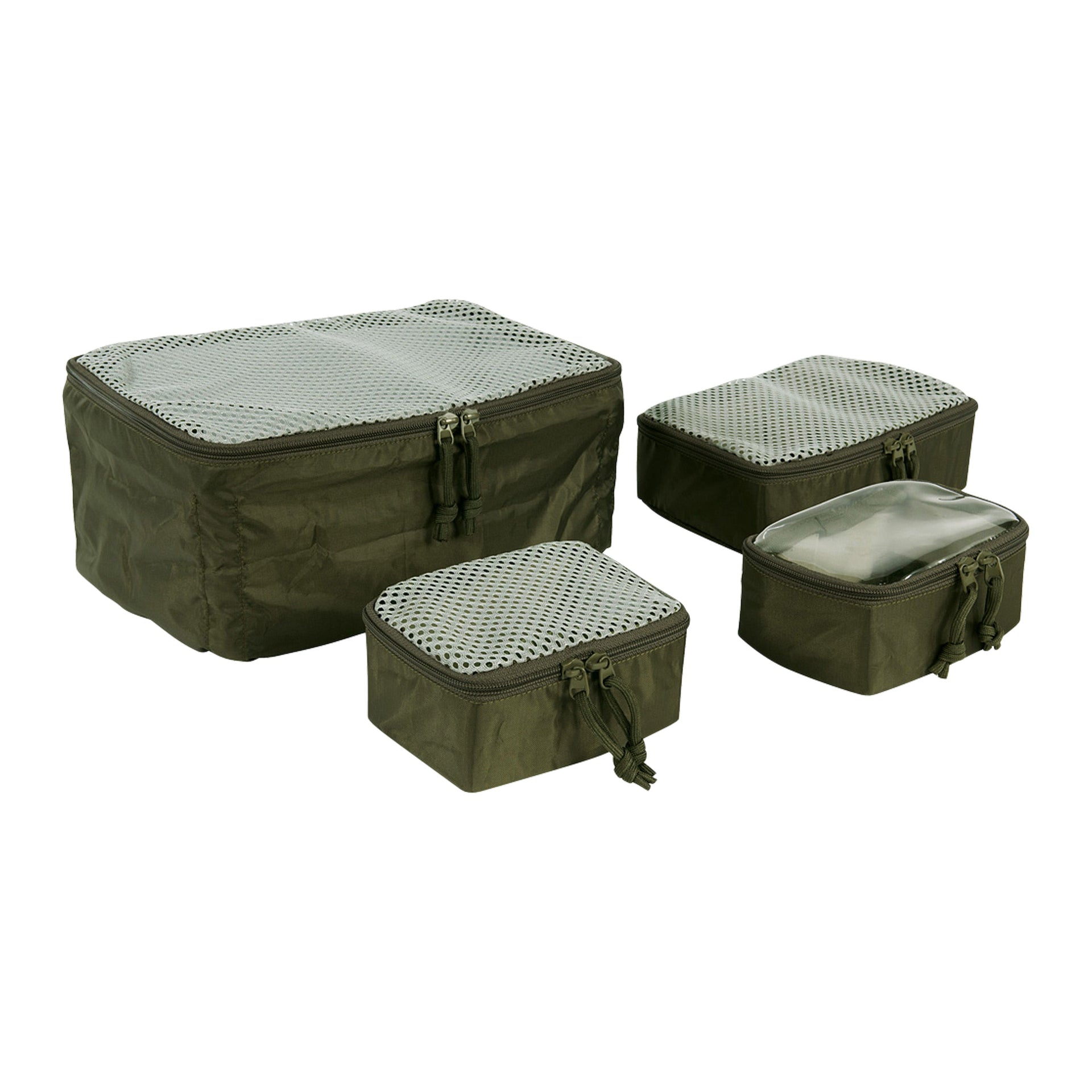The set consists of 4 mesh pockets in 3 sizes. The largest bag can be compressed and thus easily stored empty. On the back is Hook and Loop hooks for the modular use and attachment of other equipment.